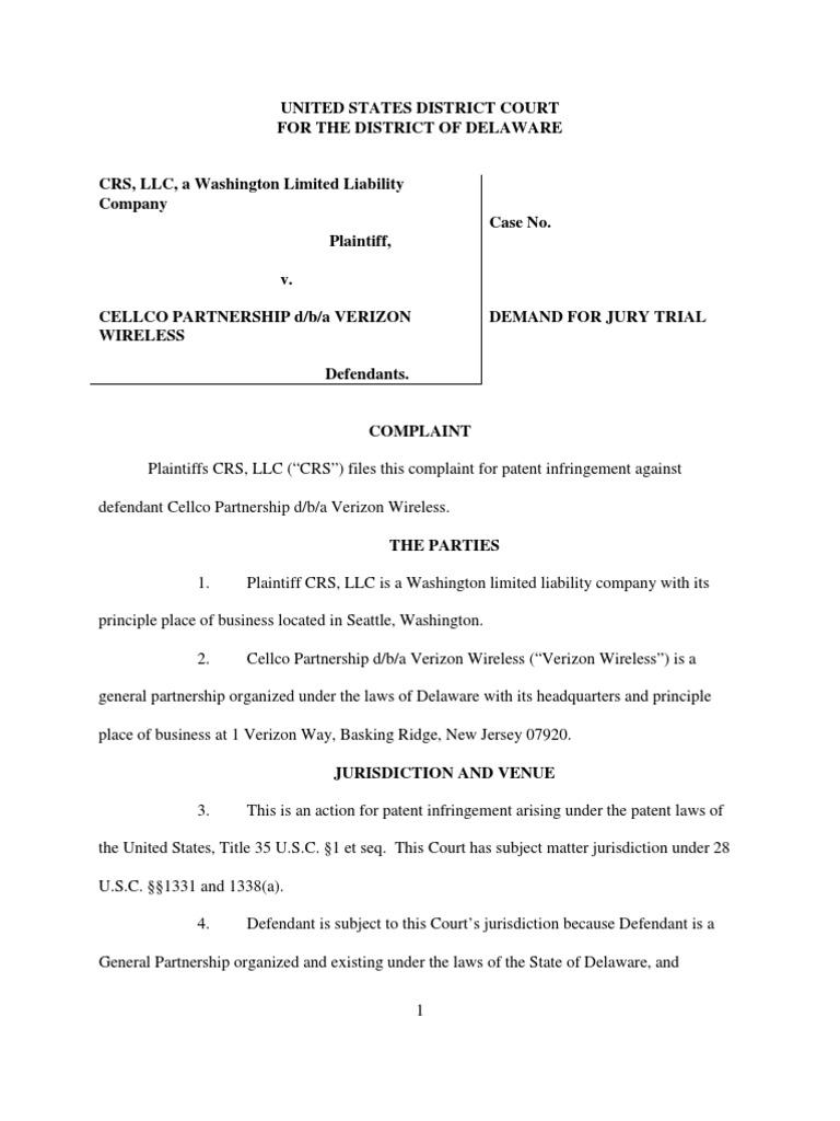 Crs v. Cellco Partnership d/b/a Verizon Wireless Patent Lawsuit